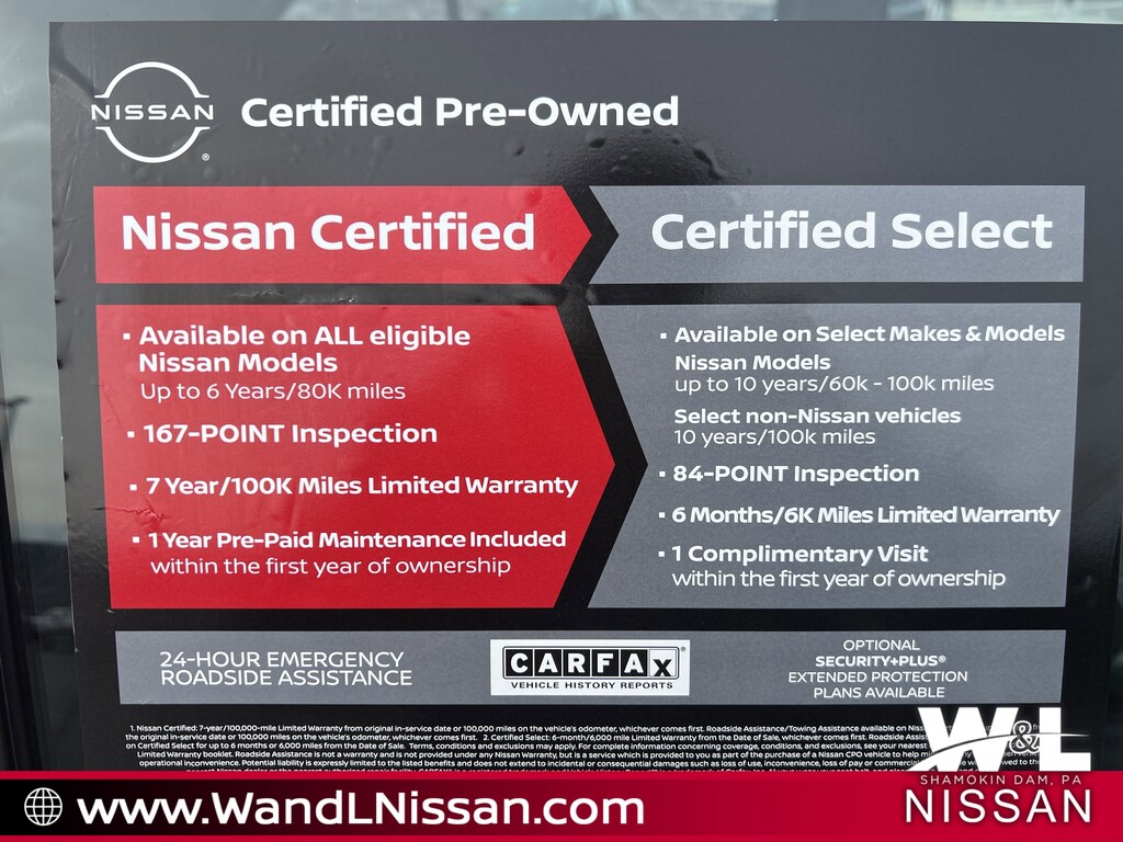 Founded in 1965, W&L has been providing a friendly, no-hassle car buying experience for more than 40 years. We have been family owned and operated from the start, and we take pride in our no-pressure sales environment. We are proud to offer free loaner vehicles for our service customers when needed, free lifetime state inspection for ALL your household vehicles every 5th oil change free, and also free pick-up and delivery for local service customers. At our dealership you will find the most popular new Nissan models, as well as a comprehensive array of used cars, trucks, crossovers and SUVs. Our courteous, experienced and professional staff is waiting to assist you. That's the W&L Difference! We have a strong and committed sales staff with many years of experience satisfying our customers' needs. Feel free to browse our inventory online, request more information about vehicles, set up a test drive or inquire about financing! Our showroom is cleaned nightly and we follow the CDC guidelines to keep both our staff and your family safe and healthy. Our showroom is located at 3819 N Susquehanna Trail, Shamokin Dam, PA 17876, right in the heart of Pennsylvania. We have served many customers from Winfield, College Park, Lewisburg, Potts Grove, Milton, Mooresburg, Mausdale, Danville, Riverside, Rushtown, Klines Grove, Snydertown, Oaklyn, Sunbury, Stroudsburg, Hanover, Mechanicsburg, Harrisburg, Hazleton, Muncy, State College, Larksville, Lebanon, and York. Call us today at 866-981-9358 or visit us on the web at www.wandlnissan.com.
